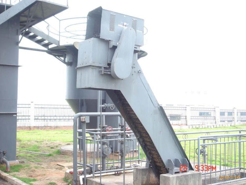 一、產(chǎn)品概述LFC型鏈板回轉(zhuǎn)式格柵清污機(jī)是我公司生產(chǎn)的一種能夠連續(xù)自動工作的清污設(shè)備,由柵條攔截液體中的雜物,耙齒板從柵條背面下降***底部后,回轉(zhuǎn)***柵條的前面,由下而上地將柵渣提升***卸科口排出,達(dá)到固液分離的目的,寬度***大可達(dá)4米之多。耙齒板由二側(cè)的板式鏈牽引,作循環(huán)運(yùn)行,可有效地把木塊、竹竿等較大雜物和格柵底部的泥砂清除。本格柵清污機(jī)主要由架體、牽引鏈、傳動系統(tǒng)、齒耙組合、水下導(dǎo)輪組合等組成。是各種水源進(jìn)口不可缺少的諸多格柵中應(yīng)用***為廣泛的一種設(shè)備。二、適用范圍該格柵清污機(jī)用來攔截、清除水中的漂浮雜物,使后續(xù)處理工序得以順利進(jìn)行。該機(jī)工作效率高,運(yùn)動平穩(wěn)格柵前后水位差小,并且不堵塞,是一種較理想的除污機(jī)械。可廣泛應(yīng)用于:城市污水處理中各類雨水、污水泵站進(jìn)水口;給水提升泵站進(jìn)水口;市政污水、工業(yè)污水處理廠的進(jìn)水口處;紡織、造紙等工業(yè)污水處理系統(tǒng)進(jìn)水口;屠宰、食品加工、生活污水等污水處理系統(tǒng)進(jìn)水口。三、性能特點?驅(qū)動裝置采用擺線針輪減速機(jī),噪聲低,結(jié)構(gòu)緊湊,運(yùn)行平穩(wěn)安全。?機(jī)架具有獨特的框架結(jié)構(gòu),剛性強(qiáng),且易安裝維護(hù)。分碳鋼和不銹鋼,碳鋼機(jī)架作防腐處理。?傳動部分均采用不銹鋼材料,可有效防止設(shè)備的腐蝕損壞。?耙齒板采用數(shù)控機(jī)床加工,精度高,外表美觀。其柵距可根據(jù)用戶要求進(jìn)行確定。?齒耙柵后下行,柵前上行撈渣,不會將柵渣帶入水下,撈渣徹底。?當(dāng)?shù)撞砍练e物(泥砂,碎石)較多時,不會堵耙,避免造成事故。?PLC自控系統(tǒng)可根據(jù)格柵前后液位差來控制其自動運(yùn)行,動作程序可靠,故障率低;并且在現(xiàn)場設(shè)有手動開關(guān),實現(xiàn)手動操作??筛鶕?jù)用戶需要,按實際需求設(shè)計運(yùn)行程序和留有總控制的接口實現(xiàn)遠(yuǎn)程控制。操作簡單、靈活、安全。?為防止意外過載,設(shè)有過載電流保護(hù),并在驅(qū)動鏈輪上設(shè)計有安全銷保擴(kuò),實行機(jī)械和電氣雙重保護(hù),使本系統(tǒng)運(yùn)行安全可靠。?整機(jī)調(diào)試后出廠,安裝方便。?檢修保養(yǎng)時,格柵可繞水上支點旋轉(zhuǎn)出水面,維護(hù)方便。四、工作原理自動格柵清污機(jī)是一種特制的耙齒配成一組連續(xù)工作的機(jī)構(gòu),在電機(jī)減速器的傳動之下,鏈輪驅(qū)動耙齒轉(zhuǎn)動,耙齒鏈的下部浸入進(jìn)排水溝槽中,當(dāng)耙齒按工作方向運(yùn)動時橫排耙齒即把液體中的固態(tài)物質(zhì)清理出來,當(dāng)耙齒轉(zhuǎn)到設(shè)備的上部時,由于槽輪與彎軌的道向,使每次耙齒之內(nèi)產(chǎn)生相當(dāng)自凈運(yùn)動,大部固體物質(zhì)重力落下,另一部分依靠橡膠刷的反向運(yùn)動,可以把粘在耙齒上的雜物洗刷干凈,確保流體順利通過。